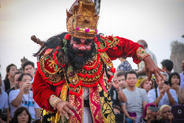 During our trip to Bali, we stopped at the temple in Uluwatu to catch the breathtaking sunset and the kecak dance. The kecak dance tells the Ramayana story. However, this is not the typical Indonesian production of the story which usually involves the gamelan or wayang puppets. In the kecak dance, about 40 men come together chanting to imitate the traditional instruments used. Despite the throng of fanny-pack sporting, sock and sandal wearing tourists, it was still an enjoyable experience, topped off by the enchanting sunset over the temple on the cliff.